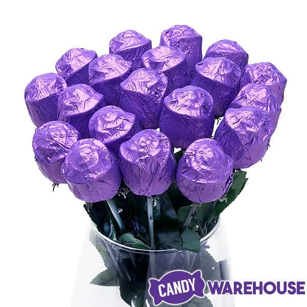 The best gift combination? Flowers and chocolate of course! Delicious Belgian milk chocolate is molded into the shape of a rose and then wrapped in distinctive metallic foil of a shiny purple color. Whether you’re designing a candy bar for a wedding or bat mitzvah, celebrating Mother’s Day, or hosting a party with a purple color scheme, these long stem purple chocolate roses offer a unique solution for candy in purple!