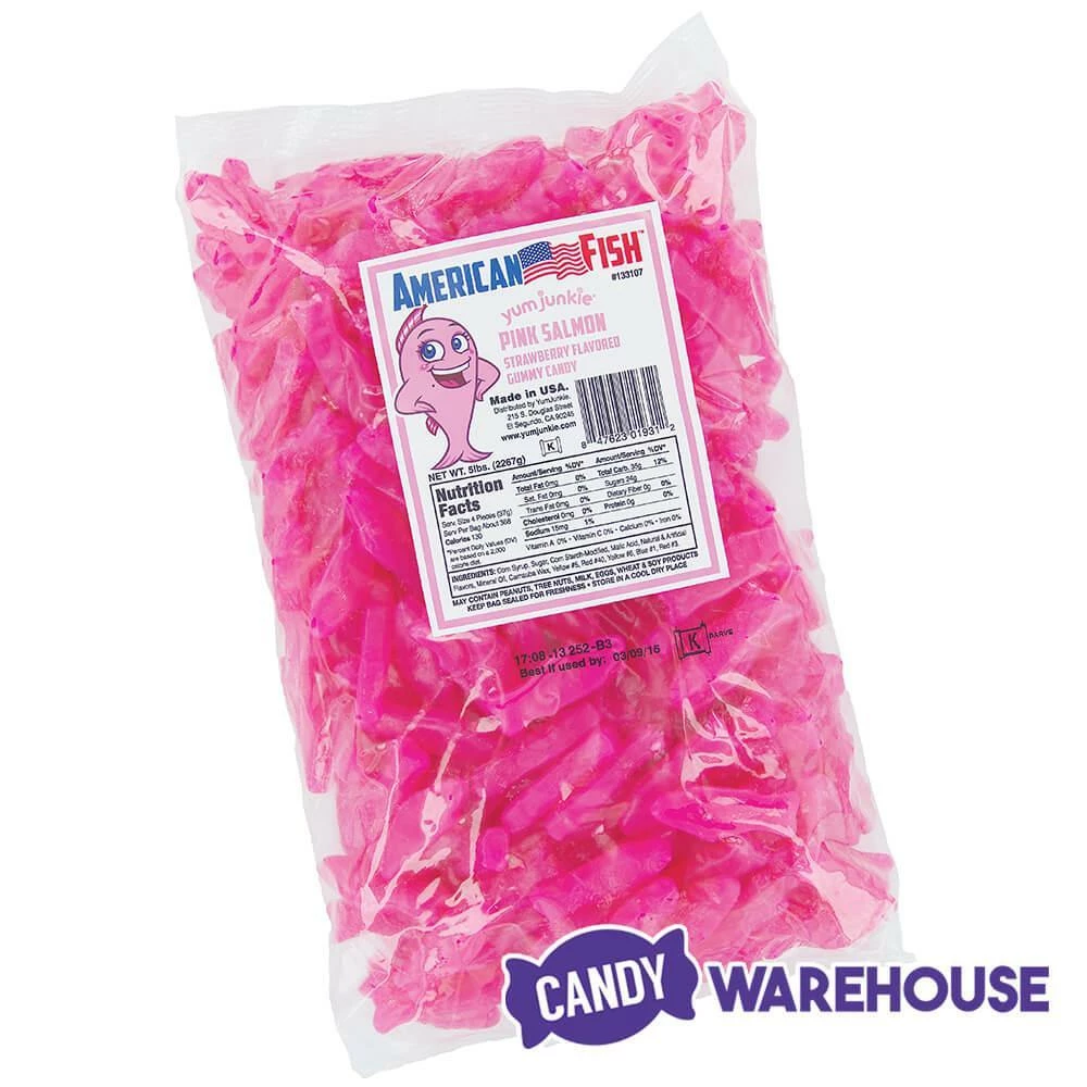 Bag contains 5 pounds of American Fish Pink Salmon Gummy Candy.