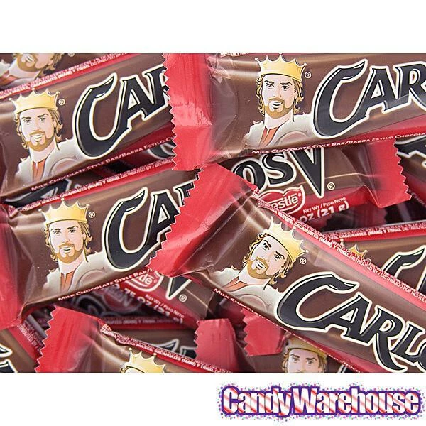 Display box contains 96 Carlos V Mini Milk Chocolate Candy Bars, each with a net weight of 0.70 ounce.
