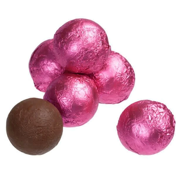 Bag contains 2 pounds of Bright Pink Foiled Milk Chocolate Balls Candy.