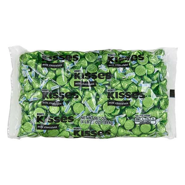 Bag contains 4 pounds of Hershey’s Kisses Kiwi Green Foiled Milk Chocolate Candy.