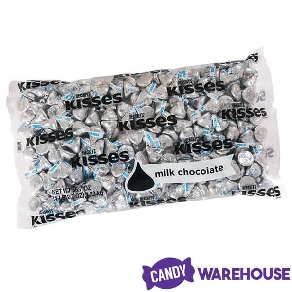 Bag contains 4 pounds of Hershey’s Kisses Silver Foiled Milk Chocolate Candy.