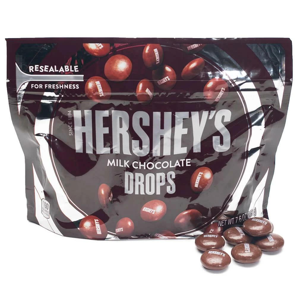 Resealable pouch contains 7.6 ounces of Hershey’s Milk Chocolate Drops Candy… that’s about 70 pieces.