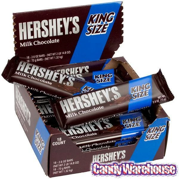 Display box contains 18 Hershey’s Milk Chocolate King Size Candy Bars, each with a net weight of 2.6 ounces.