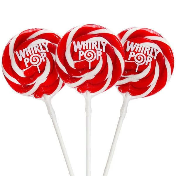 Elegant Whirly pops in swirling red and white colors. These lollipops have a fabulous cherry flavor and feature a sturdy, longer-than-average stick that helps you enjoy them without accidentally licking the knuckles and fingers of your hand that holds the stick.