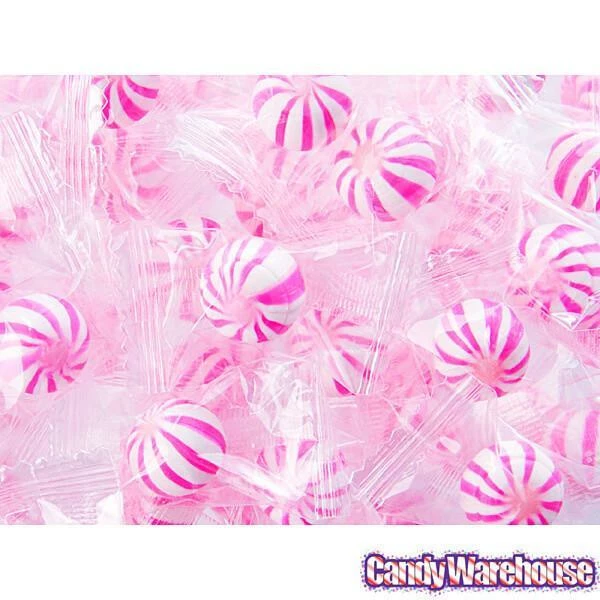 Bag contains 5 pounds of Pink Sassy Spheres Petite Striped Candy Balls.