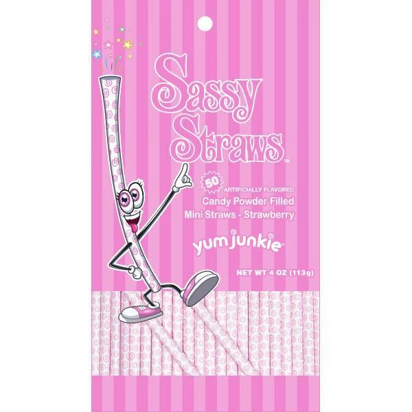Bag contains 50 Sassy Straws Pink Strawberry Candy Powder Filled Mini Straws.